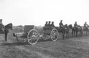 A horse drawn Schneider 75mm cannon. In 1915, the Bulgarian Army had 428 quick-firing 75 mm field guns.[77]