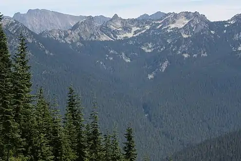 During the Pleistocene period dating back over two million years ago, glaciation advancing and retreating repeatedly scoured the landscape leaving deposits of rock debris.[7] The last glacial retreat in the Alpine Lakes area began about 14,000 years ago and was north of the Canada–US border by 10,000 years ago.[7] The U-shaped cross section of the river valleys is a result of that recent glaciation. Uplift and faulting in combination with glaciation have been the dominant processes which have created the tall peaks and deep valleys of the Alpine Lakes Wilderness area.
