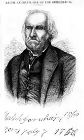General Gage surveyed the works from Boston with his staff, and Loyalist Abijah Willard recognized his brother-in-law Colonel Prescott. "Will he fight?" asked Gage. "As to his men, I cannot answer for them," replied Willard, "but Colonel Prescott will fight you to the gates of hell."[42] Prescott lived up to Willard's word, but his men were not so resolute. When the colonists suffered their first casualty, Prescott gave orders to bury the man quickly and quietly, but a large group of men gave him a solemn funeral instead, with several deserting shortly thereafter.[42]