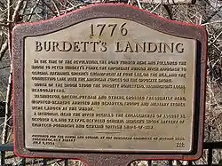 Burdett's Landing lay adjacent to a 250-foot (76 m) bluff formerly known as Mt. Constitution,[1] now known as Fort Lee Historic Park. The bluff slopes downward on the south side and levels out sufficiently to make access practical. Burdett's Landing was created here in a small cove. A 1900 history described it as lying at "the bottom of a clove [i.e., ravine] giving easy access to the top of the Palisades and at the outlet of a small watercourse known as Dead Brook."[2] The landing no longer exists, and the property lies in the current Edgewater Colony, an organization which owns all land cooperatively.[3] A plaque beside the Edgewater Colony's meeting hall, located about 100 feet (30 m) from the original site, commemorates Burdett's Landing.