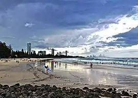 ![]() A beach in Burleigh Heads with high rise developments further in the background | |||||||||||||||