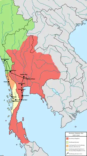 The Burmese–Siamese War (1759–1760) (Burmese: ယိုးဒယား-မြန်မာစစ် (၁၇၅၉–၁၇၆၀); Thai: สงครามพม่า-สยาม (พ.ศ. 2302–2303)) was the first military conflict between the Konbaung dynasty of Burma (Myanmar) and the Ban Phlu Luang Dynasty of the Ayutthaya Kingdom of Siam. It reignited the centuries-long conflict between the two Southeast Asian states that would last for another century. The Burmese were "on the brink of victory" when they suddenly withdrew from their siege of Ayutthaya because their king Alaungpaya had fallen ill.[6] He died three weeks later, ending the war.