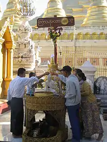 The signs can be represented in a nine-square diagram. The exact arrangement is used to place the planetary figurines in the "Ceremony of the Nine Gods", with Ketu in the center, right behind a statue of the Buddha. All the planetary figures face the Buddha (as the animist practice has been absorbed into Burmese Buddhism).[6]