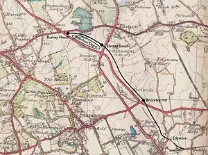 The station was the last of three planned by London Passenger Transport Board (LPTB) in 1935 for an extension of the Northern line from Edgware.[1] It would have served as the new terminus of the line. There was debate about the name for the station, with West Elstree, Caldecote Hill, South Aldenham, Aldenham, Bushey Heath and Aldenham and Bushey and Aldenham being proposed.[2][n 1] The previous station on the route would have been Elstree South to the east.