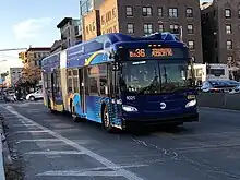 The Bx36 replaced 180th Street Crosstown Line streetcars on October 25, 1947. Its original south-eastern terminus was at Bruckner Boulevard-Zerega Avenue via Cross Bronx Expressway, running all times except nights until February 1984. On February 14, 1965, every other bus on the route was extended one mile to run to Pugsley Avenue and Story Avenue, instead of to the previous terminal of Chatterton Avenue and Zerega Avenue. These buses would turn off the regular route at Westchester Avenue and White Plains Road, running south on White Plains Road, Houghton Avenue, and Pugsley Avenue to the terminal, and via Story Avenue and White Plains Road before turning back onto Westchester Avenue for the return trip to Manhattan.[1] In November 1967, a full-time terminus was established at White Plains Road and Story Avenue, but later as part of the July 1974 service changes, it was extended to its current southeastern terminus. Eastbound buses were rerouted to use East 174th Street in both directions, with service on Cross Bronx Expressway being taken over by the Q44. On September 13, 1987, the Bx36 was extended from 181st Street and Broadway to the outside of the George Washington Bridge Bus Station at 179th Street and Broadway[2][3] and later on January 18, 1998, buses in both directions were rerouted to use Wadsworth Avenue instead of Broadway.[4] Westbound trips were streamlined onto White Plains Road, whereas they had previously deviated to Hugh Grant Circle/Parkchester station prior to September 2000. On September 8, 2009, the Bx36 Limited began service during rush hours, consisting of every other Bx36 during rush hours, and possibly saving up to eight minutes in each direction.[5] In 2017, the MTA released its Fast Forward Plan, aimed at speeding up mass transit services.[6] As part of it, a draft plan for the reorganization of Bronx bus routes was proposed in draft format in June 2019, with a final version published in October 2019.[7][8] The plan included rerouting service on Tremont Avenue and White Plains Road rather than 180th Street, Boston Road, and 174th Street, with the rerouted Bx40/Bx42 covering 180th Street and the rerouted Bx11 covering 174th Street. Changes would apply to both local and limited-stop variants and were proposed to be implemented by mid-2020.[9][10] Due to the COVID-19 pandemic in New York City, the changes were halted for over a year.[11][12][13] The modification took place on June 26, 2022.[14][15]