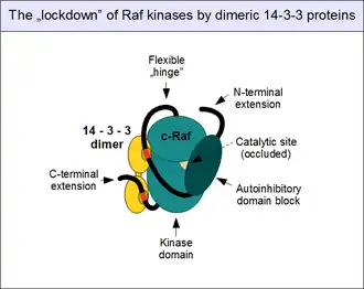 Note that 14-3-3 binding of Raf enzymes is not necessarily inhibitory: once Raf is open and dimerizes, 14-3-3s can also bind in trans, bridging two kinases and "handcuffing" them together to reinforce the dimer, instead of keeping them away from each other.[42] Further modes of 14-3-3 interactions with c-Raf also exist, but their role is not well known.[43]
