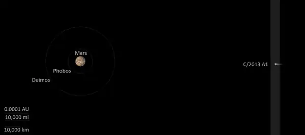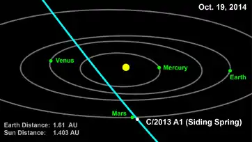 C/2013 A1 passed the planet Mars very closely on 19 October 2014, at a distance of 140,496.6 ± 4.0 km (87,300.5 ± 2.5 mi; 0.000939162 ± 2.7×10−8 au).[7] After its discovery, there was thought to be a chance of a collision with Mars, but this possibility was excluded when its orbit was determined with about a 200-day observation arc.[8]