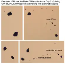Early erythroid progenitors are found at a quite low frequency relative to later stages of erythroid differentiation, such as the pro-erythroblast and the basophilic erythroblast stages which can be detected by flowcytometry directly ex-vivo.[4] Furthermore, unlike for the pro-erythroblast and later stages of erythroid development, no truly reliable and unique positive flow-cytometric markers exist, though it is possible to use negative exclusion markers to deplete a cell population of other precursors and differentiated cells by cell sorting, thus greatly enriching it for the CFU-E activity.[5] CFU-E cells express Epo receptor, c-Kit (Stem cell factor receptor), transferrin receptor (CD71+), and are Ter119(glycophorin-A associated antigen)-negative. For the above reasons, the CFU-E assay, as inefficient and variable as it can often be, is still in use today.