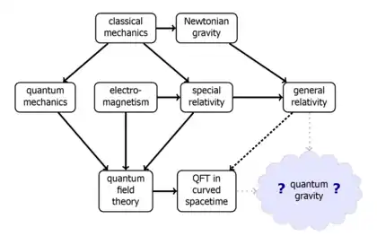Diagram showing where quantum gravity sits in the a near-cube hierarchy of physics theories. Note that electromagnetism and quantum field theory in curved spacetime are added in as an extra and distinct items.