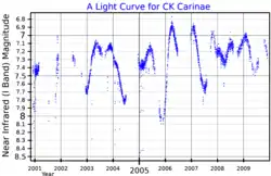 Classified as a semiregular variable star, CK Carinae's brightness varies between apparent magnitudes +7.2 and +8.5 with a period of approximately 525 days.[3] It has a Gaia Data Release 2 parallax of 0.4286±0.0806 mas,[5] which implies a distance of around 2,300 pc, and is thought to be a member of the Carina OB1-D stellar association which is at a distance of about 2,200 pc.[2][8] An analysis of the distances of apparently-nearby OB stars implies a distance of 2,920 pc for CK Carinae.[6] It has an MK spectral classification of M3.5 Iab, with the luminosity class indicating an intermediate luminosity supergiant.[4]