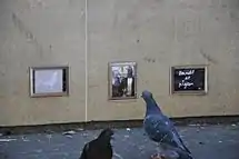 In September 2012, he set up an exhibit for pigeons[6] right in front of the Centre Georges Pompidou in Paris, and hung about twenty of the most famous art pieces - that he would obviously have hijacked first - at eyes-height of the birds.