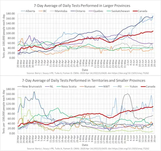 - ↑ Berry, Isha; Soucy, Jean-Paul R.; Tuite, Ashleigh; Fisman, David (April 14, 2020). "Open access epidemiologic data and an interactive dashboard to monitor the COVID-19 outbreak in Canada". CMAJ. 192 (15): E420. doi:10.1503/cmaj.75262. ISSN 0820-3946. PMC 7162433. PMID 32392510.