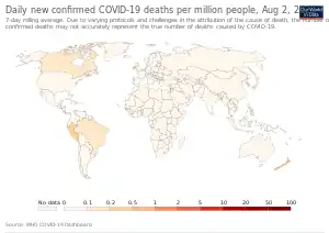 - ↑ World map of daily new confirmed COVID-19 deaths per million people by country. From Our World in Data.The chart tab has a timeline graph of worldwide daily new deaths per million people. Drag the timeline for numbers by date.