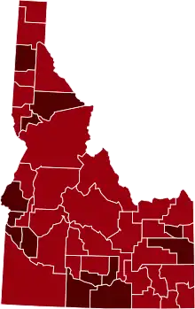 ![]() Map of the outbreak in Idaho by confirmed total infections per 100,000 people (last updated March 2021)