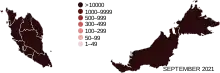 At least two regional outbreaks have occurred since July 2020. In late July and August, several clusters emerged in Kedah and Sarawak.[78][79][80] In September 2020, a major outbreak in Sabah initially detected in two prisons led to a spike in community cases within that state. Following the 2020 Sabah state election, the number of cases rose across the country due to Sabah voters returning to work in other states. Malaysian authorities also attributed the surge of cases in Sabah to the entry of illegal immigrants from Indonesia.[81][82] The country passed the 10,000 cases mark on 16 September 2020, and 11 deaths, primarily in Kedah and Sabah, were reported between the month ends of August and September.[83]