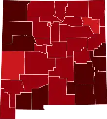 ![]() Map of the outbreak in New Mexico by confirmed total infections per 100,000 people (last updated March 2021)