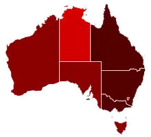 No deaths from COVID-19 were recorded in Australia from 28 December 2020 until 13 April 2021, when an overseas returned traveller died at The Prince Charles Hospital, Brisbane.[73] There were then none until 11 July, when NSW Health reported a COVID-19 death from the NSW Delta outbreak. In late August 2021, Victoria also reported its first deaths since the end of the outbreak in June 2020 that saw the longest lockdown period in Australia at the time.[74][75][76] In response to rising cases, both New South Wales [77] and Victoria [78] underwent extended lockdowns, taking 107 and 77 days respectively, with both states opening up in October 2021. During this time, other Australian states closed their borders to these two states.[79]