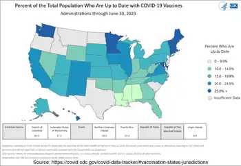 ![]() Percent of the total population who are up to date with COVID-19 vaccines. Hover on the states on the map at the source page for exact numbers. Right-click on the source map, and then click "Show as a table" to get all the numbers.[1] | |