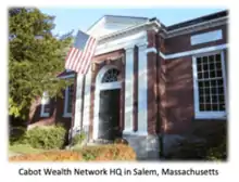 Cabot Wealth Network is an independent investment advisory company based in Salem, Massachusetts. The company's primary service is the publication of 12 investment advisory newsletters, which cover a range of investment styles, with an estimated 225,000 readers.[1] It also publishes the Cabot Wealth Daily website and newsletter. Founded in 1970 by the late Carlton Lutts Jr.[2]