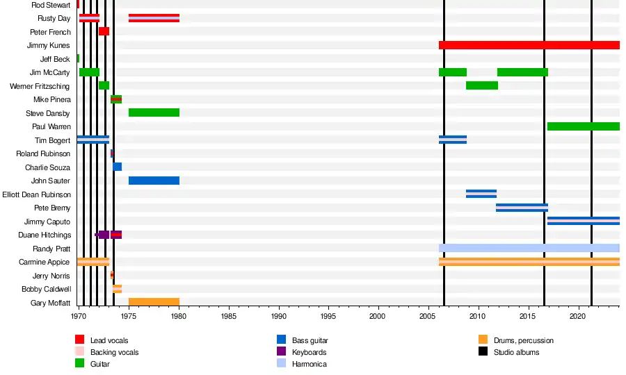 In 2017, Jimmy Caputo was announced as the band's new bassist and Paul Warren (formerly with Rare Earth, Richard Marx and Rod Stewart) was brought in on guitar, after Jim McCarty was forced to step away from touring due to health issues.[6]