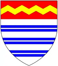 Arms of Haydon: Argent, three bars gemels azure on a chief gules a fess dansettée or
