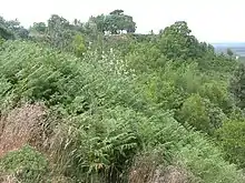 Caesar's Camp is an Iron Age hill fort straddling the border of the counties of Surrey and Hampshire in southern England. The fort straddles the borough of Waverley in Surrey and the borough of Rushmoor and the district of Hart, both in Hampshire.[1] Caesar's Camp is a Scheduled Ancient Monument with a list entry identification number of 1007895.[2] It lies approximately 3 kilometres (1.9 mi) north of the town of Farnham, and a similar distance west of Aldershot.[3] The hillfort lies entirely within the Bourley and Long Valley Site of Special Scientific Interest.[4] Caesar's Camp is a multivallate hillfort, a fort with multiple defensive rings, occupying an irregular promontory, with an entrance on the south side.[1][5] The site has been much disturbed by military activity, especially at the southeast corner.[1] The remains of the hillfort are considered to be of national importance.[5]