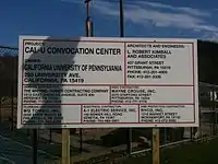 A ceremonial ground-breaking ceremony was held on August 5, 2009.[1] The convocation center was constructed across from Hamer Hall in the area which previously served as the Hamer Parking Lot. While the university is looking for a sponsor for naming rights, the building has been officially deemed the "California University Convocation Center." Dr. Angelo Armenti, President of Cal U, stated in the groundbreaking ceremony that the center "will be a landmark building for our campus,”and “Besides meeting the University’s needs, it will serve as a cultural resource and contribute to the economic vitality of Southwestern Pennsylvania.”