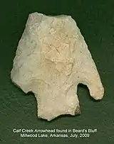 The Calf Creek people were noted for their use of large, heat-treated flint spearheads. The Calf Creek point was first named and described in an Arkansas amateur archaeological journal by Don Dickson in 1968, for examples found at Calf Creek cave in Searcy County Arkansas. The cave was named for a small, perennial stream that runs nearby.