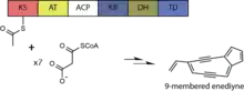 - ↑ Horsman, GP; Chen, Y; Thorson, JS; Shen, B (Jun 22, 2010). "Polyketide synthase chemistry does not direct biosynthetic divergence between 9- and 10-membered enediynes". Proc Natl Acad Sci U S A. 107 (25): 11331–5. Bibcode:2010PNAS..10711331H. doi:10.1073/pnas.1003442107. PMC 2895059. PMID 20534556.