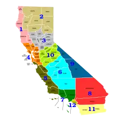 | 4 | Alameda, Contra Costa, Marin, Napa, San Francisco, San Mateo, Santa Clara, Solano, Sonoma, | Oakland |
