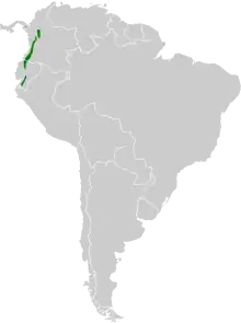 The purple-throated woodstar is found discontinuously in eastern Panama's Darién Province, along both slopes of Colombia's western Andes and south to central Ecuador, and in southern Ecuador. It inhabits the edges and interior of humid forest and cloudforest. In elevation in ranges from sea level to 2,400 m (7,900 ft) but is most numerous above 1,000 m (3,300 ft).[8]