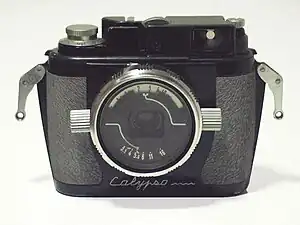 The vertical running metal-plate focal-plane shutter of the original Calypso has speeds from 1/30 to 1/1000 second, but a year later that was changed to 1/15 to 1/500 second. The camera was very early on advertised, and possibly sold as, the Calypso Phot.
