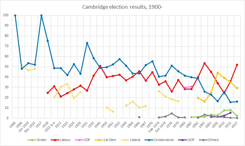 From 1910 to 1992, Cambridge was won by the Conservatives, save for 1945 to 1950 and 1966 to 1968, when it was Labour-held with small majorities.
