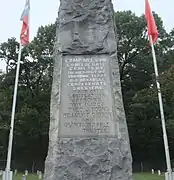 Photo of the 12-foot memorial stone obelisk erected in the center of the cemetery with three flagpoles in background containing flags of United States, Texas, and Arkansas