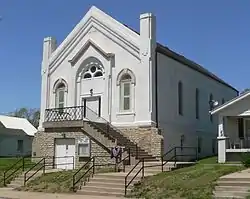 It is a one-story gable-front south-facing church built of red brick in 1878. Its exterior was stuccoed and painted white in 1919. A limestone staircase in front was added in the 1950s.[2]