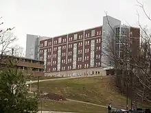 • Wadsworth Hall is a coed dormitory that currently houses approximately 1,100 students. When the dormitory was first built it could only accommodate 356 people, but two additions have been made to the building since its opening. The dormitory was built in 1955 and is named after Dr. Marshman E. Wadsworth, who was president of Michigan Tech from 1887 to 1898. Wadsworth Hall is commonly referred to by its residents as Mother Wads and others as Wads.[33] Wadsworth Hall was renovated in December 2003 and the project was completed in the fall of 2005. The renovation of Wadsworth Hall cost around $31.3 million. The project updated all the plumbing and electrical wiring throughout the building. It also updated the layout of the building to give the students more privacy, a better community bathroom, and kitchenettes where students could study, cook, and socialize. The renovations also resulted in an updated cafeteria; the layout was changed from one long line of food to an open-market type of cafeteria, which reduced waiting in line for food.[34]