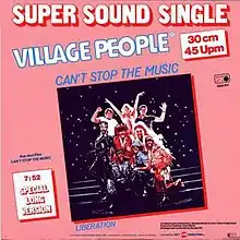 "Can't Stop the Music" is a song recorded by American disco group the Village People. As the group's first release after the exit of original lead singer Victor Willis, with lead vocals sung by replacement cop Ray Simpson, the song was the first Village People single since their commercial breakthrough to not chart inside the US top 40, though it fared much better in Europe (reaching #7 in Belgium, #10 in West Germany, #11 in the UK, #15 in Sweden, #18 in Ireland, and #19 in Austria), South Africa (reaching #1 in the country), and Oceania (reaching #1 in Australia and #2 in New Zealand). It is the title track from the soundtrack album of their feature movie, Can't Stop the Music, which failed to attract a major audience, except in Australia.[1]