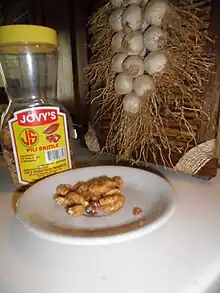 The most important product from pili is the kernel. A testa (seed coat) is between the shell and the kernel.[3] When raw, its flavor resembles that of roasted pumpkin seed, and when roasted, its nutty flavor and waxy texture make it similar to the pine nut.[8] Research from the Institute of Plant Breeding, University of the Philippines Los Baños, describes pili nuts of high quality as large, round kernel, and a thin pulp and shell. The contents should have a white pulp, high in protein and oils with mild nutty flavor.[9]