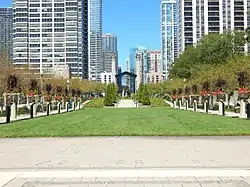 At its entrance are two 40-foot Corinthian columns salvaged from Chicago’s 1905 Federal Building. The columns are on axis with the classical columns of the Field Museum of Natural History located at the far south end of Grant Park.[3] Architect Henry Ives Cobb designed the columns. Before being placed in the Cancer Survivors Garden, the columns were submerged near the Lake Michigan shoreline in 1983 to help reinforce a breakwater.[1] The Chicago Architecture Foundation donated the columns to be placed next to the garden’s main pavilion.