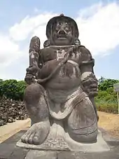 In East Javanese art and Balinese version however, the dvarapala usually depicted rather well-built and muscular, with a fine example taken from Adan-adan site near Kediri.[19] The exception is a gigantic dvarapala of Singhasari near Malang, East Java that measures 3.7 metres (12 ft) tall. The most notable dvarapala statues are those of candi Sewu, each pair guarding four cardinal points of the grand temple complex, making them a total eight large dvarapala statues in perfect condition. The dvarapalas of Sewu temple has become the prototype of Gupolo guardian in later Javanese art, copied as guardians in Javanese keratons of Yogyakarta and Surakarta. Another fine example is two pairs of dvarapala guarding the twin temples of Plaosan.