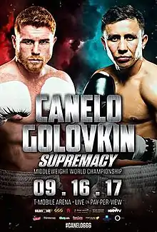 Canelo Álvarez vs. Gennady Golovkin, billed as Supremacy, was a professional boxing match contested for the unified WBA (Super), WBC, IBF, IBO, Ring magazine, and lineal middleweight championship.[1][2] The bout was on September 16, 2017, at T-Mobile Arena on the Las Vegas Strip. It was televised on HBO pay-per-view[3] in the United States, on BoxNation Box Office in the United Kingdom, and on Space in Latin America.[4]