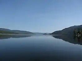 Canim Lake /ˈkænɪm/ is a lake in British Columbia, Canada. Its west end is 36 km (22.4 mi) northeast of 100 Mile House. "Canim" means a type of large canoe in the Chinook Jargon. Canim Lake is 26.5 km (16.5 mi) long. It is also part of the territory of the Shuswap First Nation where the ancestors are part of the Lake Division of the Shuswap nation of the Interior Nations of British Columbia. The Reilly Commission states that the 2,029 hectares region around Canim Lake are set aside for the Shuswap First Nation. In the summer of 1995, there was an archaeological evidence of an ancient civilization and evidence of carbon dated as 4,300 old.[1]