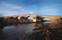 Canosa sits on the right bank of the Ofanto river (the ancient Aufidus)[4] and is nearly 20 kilometers (12 mi) from the Adriatic Sea. The town sits upon the Murgia plateau, between 105 and 140 meters (344 and 459 ft) above sea level. The city is built on a mostly sandy or clay surface that covers a limestone layer ("calcareniti of Gravina") which in turn constitutes the typical white-yellowish tuff and is easily collapsible. This morphological feature allowed the underground construction of artificial grottoes (used in the 19th century as cellars), and the creation of a Hypogeum. The tuff derived from the excavations has gone towards the construction of buildings on the surface. There are risks of subsidence due to the presence of caves and underground channels typical of karst environments. The buildings of the town of Canosa are considered high risk for collapse.[6] In recent years there have been many building failures and disruptions of roads. The area extends south to the slopes of the Murgia, and is mostly flat. The basins of Rendina and Locone contribute to the large area 150 square kilometers (58 sq mi).