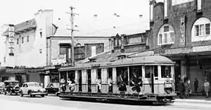 In 1921, a tram line was extended from Hurlstone Park to Canterbury station, and in 1927, a through service from Canterbury to the city commenced. The Canterbury line commenced at the Canterbury terminus in Broughton Street where a tram turning loop was provided.[6] Trams travelling towards the city or Balmain headed north-east along Canterbury Road. A service that was provided for by the Darling Street Wharf trams branched off from the main line at New Canterbury Road and connected with lines running along Parramatta Road for Balmain. Services heading towards Marrickville, Newtown, Sydenham and Tempe turned right into Marrickville Road.[7] The line from Dulwich Hill to Canterbury branched off from the Tempe line at Newtown, travelled along Enmore Road, then Victoria Road, before turning right onto Marrickville Road and all the way through to Canterbury Road to the Canterbury terminus.[7]
