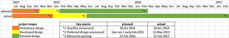 The memorial was one of the projects identified in the Christchurch Central Recovery Plan, commonly referred to as the Blueprint, released on 30 July 2012 by the Canterbury Earthquake Recovery Authority (CERA). The Blueprint gave the first quarter of 2016 as the project finish date in its indicative time line.[2] The project was led by the Ministry for Culture and Heritage, with project partners CERA, Christchurch City Council, and Te Rūnanga o Ngāi Tahu.[3] The purpose of the memorial is described as follows in the Blueprint:[4]