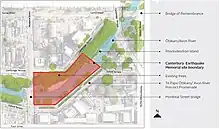 The site for the official memorial, both sides of the Avon River downstream from where Montreal Street crosses the river, was revealed in July 2014 as part of the design brief.[7] The following site description was given as part of the brief:[lower-alpha 1]