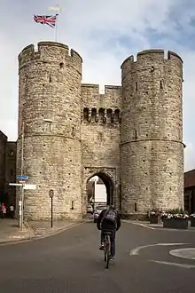 The West Gate has survived in excellent condition, and Creighton and Higham describe it as "one of the most monumental of all examples of town gate architecture".[105] Constructed from ragstone and flint, it has two large circular towers at the front, but has a square-facing interior; although fireplaces were built into each tower in the 14th century, their flues were designed to be hidden from sight so as not to spoil its military appearance.[106] The West Gate hosts a local museum and cafe.[63] A final three towers survive on the stretch of the walls between West Gate and the former North Gate.[82]