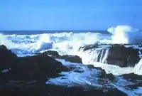 Along the Cape Perpetua coastline, there are several unique features as well. The Devils Churn is a long crack in the coastal rock that fills with each ocean wave, occasionally exploding as incoming and outgoing waves collide. The Spouting Horn at Cook's Chasm and Thor's Well on the plateau nearby are both salt water fountains driven by the power of the ocean tide.[11] Thor's Well is at 44°16′42″N 124°06′49″W / 44.278421°N 124.113499°W. Spouting Horn is at 44°16′39″N 124°06′47″W / 44.277497°N 124.112994°W. Both Thor's Well and Spouting Horn are best seen approximately an hour before high tide to an hour after high tide. How spectacular the sights are is a function of the height of the high tide and the direction and size of the swells. The wind can also be a factor. Devil's Churn, Spouting Horn and Thor's Well are popular with visitors; however, all three can be dangerous, especially at high tide and during winter storms.[1]