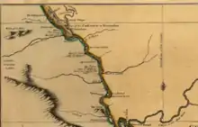 The French explorers and mapmakers used the word cape (or in French, "cap") to describe the bluffs and promontories along the Mississippi River. A "cap" could sit next to any body of water, not just the ocean.[4] Spanish authorities also used the term cabo (cape) for points on the Mississippi River. Along the Mississippi River between St. Louis and Cairo there are a number of capes of French origin.[5]