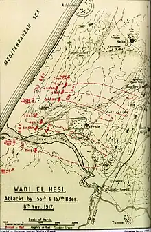 After the capture of Beersheba on 31 October by General Edmund Allenby's forces, between 1 and 7 November strong Ottoman rearguards at Tel el Khuweilfe in the southern Judean Hills, at Hareira and Sheria on the maritime plain, and at Gaza close to the Mediterranean coast, held the Egyptian Expeditionary Force (EEF) in heavy fighting. Towards the end of the week the Ottoman Army was able to withdraw mainly at night in good order, under cover of effective rearguards.[1] The Ottoman XXII Corps had not been defeated at Gaza, but conducted a skillful, tactical retreat from the town, demonstrating both operational and tactical mobility.[2] The Gaza garrison withdrew in three detachments, the Ottoman 53rd Division moved eastwards, delaying the pursuit by Desert Mounted Corps, the Ottoman 3rd Division occupied a strong rearguard position at Beit Hanun, while the Ottoman 7th Division established the Wadi el Hesi line of defences.[3] However, in conjunction with the captures in the centre of the line at Sheria, the occupation of Gaza enabled a swift direct advance northwards, preventing a strong consolidation of the Wadi el Hesi rearguard position.[4] This wadi was the second of the major watercourse on the Palestine coast, flowing parallel with, and 12 miles (19 km) north of the Wadi Ghuzzee.[5][6]
